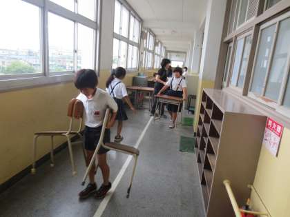 3階の5教室床を改修いたします。(夏休み中) 改修後は全て上履き使用です。そのため、3年・4年の児童は、教室内の物を協力して移動しています。