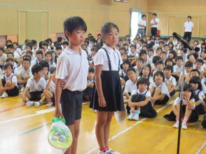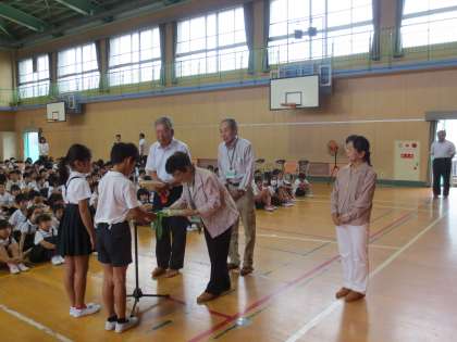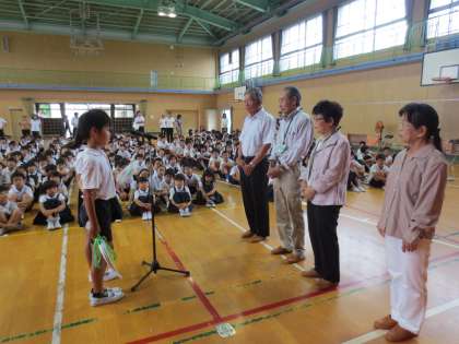 終業式を終え、地域の敬老会の方々に「手作りうちわ」をプレゼントしました。1年から6年生の全児童が作った「手作りうちわ」を代表の児童が渡しました。