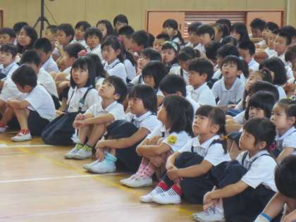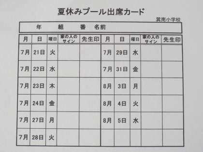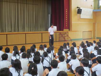 太田先生がプール開放についての注意と約束事をお話ししました。元気な夏休みにするためにも、たくさんプール開放に来て下さい。参加する人は、水着・バスタオル・サンダルと「家の人のサイン」をしてもらったプールカードを持ってくる。【忘れた人はプールに入れません】