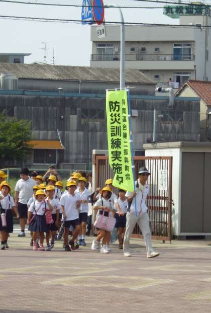 巽南地域の防災訓練が行われました。各家庭から地域の一時避難所に集合し、学校まで避難しました。