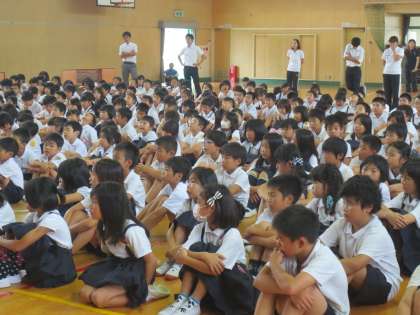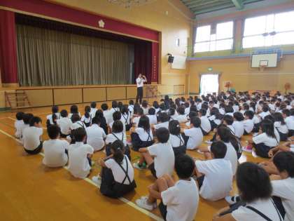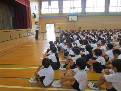 上野先生が1学期の生活面での様子と、夏休み中の生活についてお話をしました。まず、集団登校で元気よく「朝のあいさつ」ができる子どもたちを、新巽中学校の校長先生にほめられたことをお話ししました。しっかりとした高学年です。2学期も集団登校を頑張ってください。