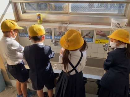 朝会後、子どもたちが教室に入る前に、しっかりと手洗いをしていました。