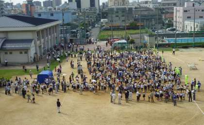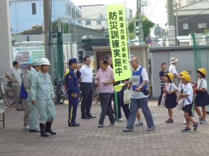 地域の避難訓練に参加しながら児童は登校。学校では「土曜授業:防災教室」を行います。