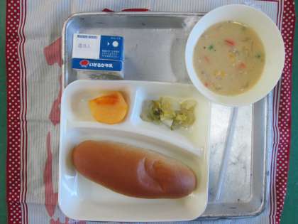 豆乳コーンクリームシチュー[米粉]、はくさいのピクルス、かき(平核無柿)、黒糖パン、牛乳