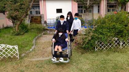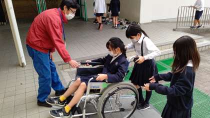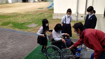 体育館から外へ出て、車いすに乗る役・押す役を交代しながら、狭い道や坂道・段差などを体験しました。