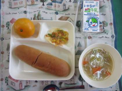 豚肉と野菜のスープ煮、変わりピザ、みかん、黒糖パン、牛乳