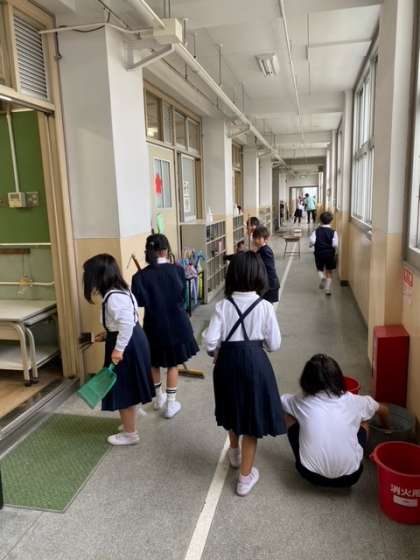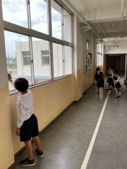 1年生の当番児童が、協力しながら教室や廊下をきれいにしていました。