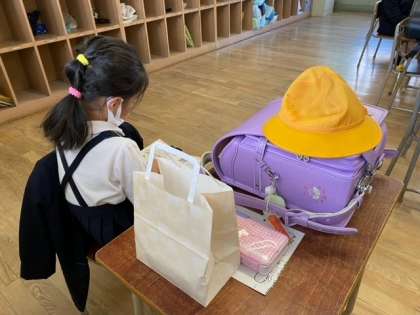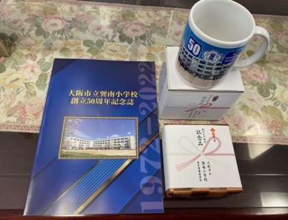 5日に実施しました50周年記念式典で、記念事業委員会から児童へ記念品をいただきました。