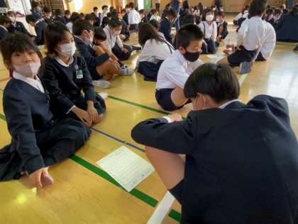 それぞれの縦割り班で協力して〇か×かを考えています。