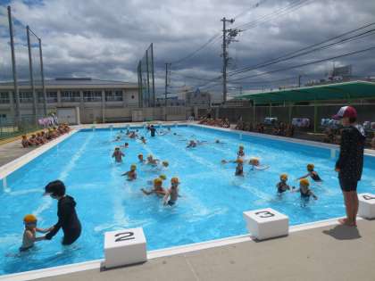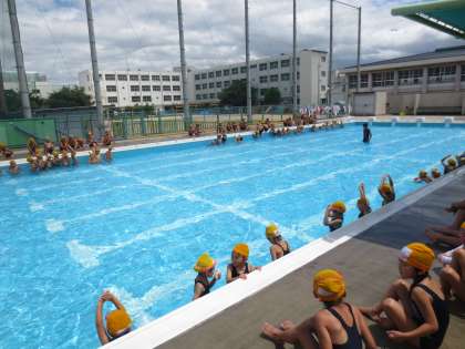 プールの横を使い、けのび、バタ足など、繰り返し泳ぎの動きを練習していました。