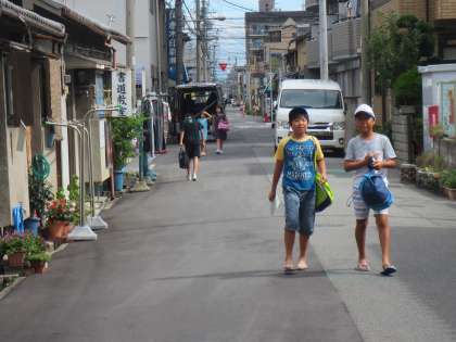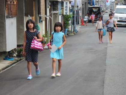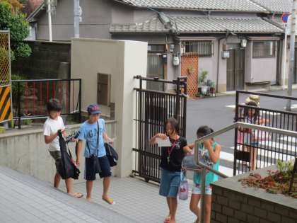 時間に遅れないように学校にきていました。参加する児童は、どの子も水着・バスタオル・サンダルと「家の人のサイン」をしてもらったプールカードを持ってきていました。