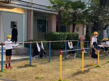 子どもたちが鉄棒で遊んでいます。