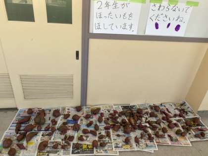 廊下の端には2年生の子どもたちが収穫した「サツマイモ」が干してありました。