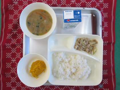 豚肉と野菜のいためもの、いわしのつみれ汁、かぼちゃういろう、ごはん、牛乳