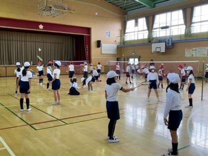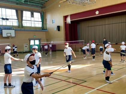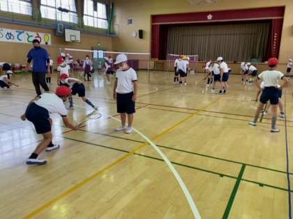 10月に体験した「バドミントンの夢授業」を思い返しながら、子どもたちが、ラケットの持ち方やシャトルの扱い方を、改めて先生に教えてもらい練習していました。