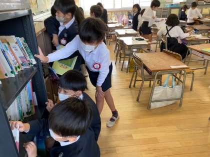 1年生の教室では、子どもたちが、学級文庫での本選びに夢中になっていました。