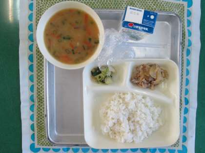 豚肉のしょうが焼き、さつまいものみそ汁、きくなとはくさいのごまあえ、ごはん、牛乳