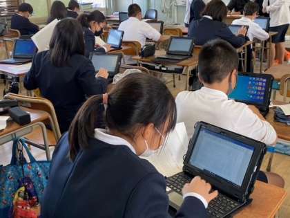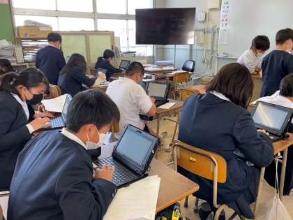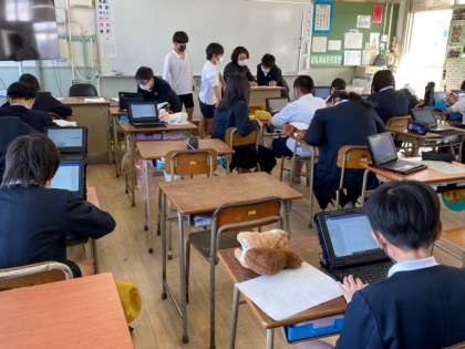 子どもたちが、担任の先生に見てもらった原稿をタブレット端末で入力していました。6年間の思い出がいっぱいです。