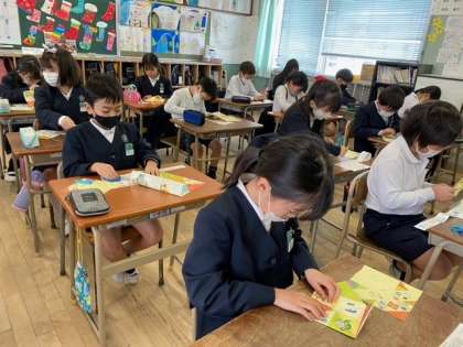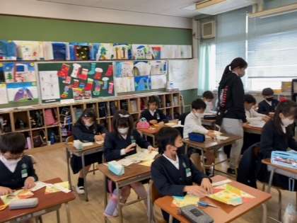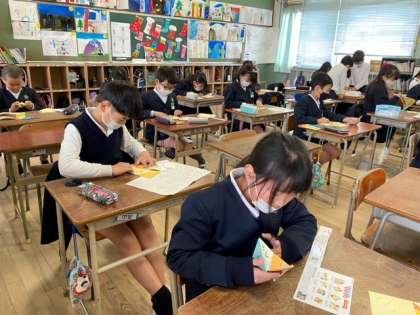 3年生の子どもたちが、「折り紙(ふれあいおりがみ)」を折っていました。