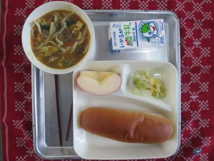 カレーうどん、はくさいのおひたし、りんご、パン、牛乳