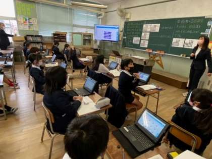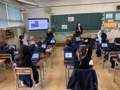 子どもたちが、タブレット端末を使って、スカイメニューの発表ノートに数のまとまりを書き込み、自分で考えた求め方を発表しました。
