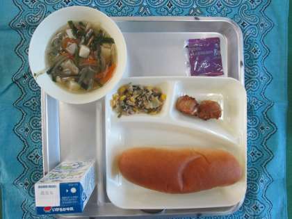 あげシューマイ、中華スープ、ツナとチンゲンサイのいためもの、パン、ブルーベリージャム、牛乳