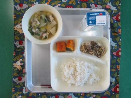 豚肉と干しずいきのみそ煮、うすくず汁、焼きかぼちゃの甘みつかけ、ごはん、牛乳