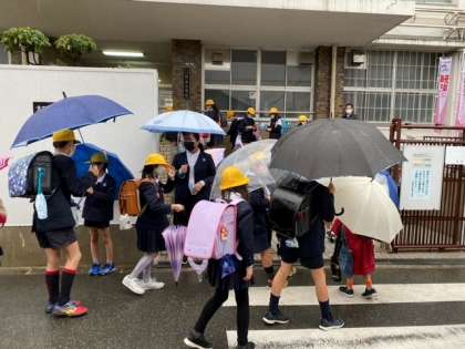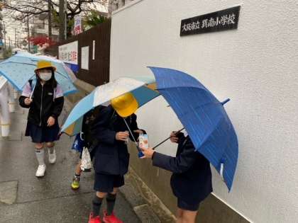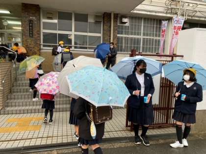正門で児童会の子どもたちが、登校してくる児童に募金の呼びかけをしています。