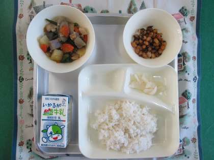 鶏肉と野菜の煮もの、ひじき豆、かぶのゆず風味、ごはん、牛乳