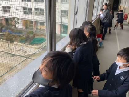 3年生の教室では、休み時間になると、子どもたちや先生が外の雪を見ようと廊下に出てきました。