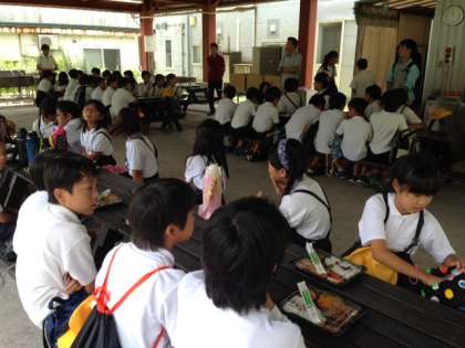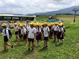 長時間バスに乗っての移動でしたが、先ほど、ハチ高原に予定通り到着しました。みんな元気です。キャンプファイヤー広場に活動班ごとに整列し、多目的広場に移動して昼食の弁当を食べます。午後1時に開所式の予定です