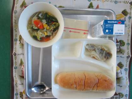あじのレモンマリネ、てぼ豆のスープ煮、スライスチーズ、おさつパン、牛乳