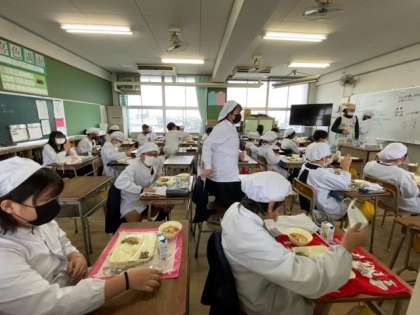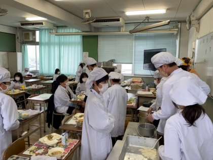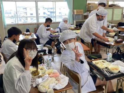 子どもたちが、「お餅」の入った温かい「おぞう煮」を味わって食べています。