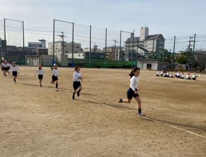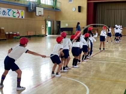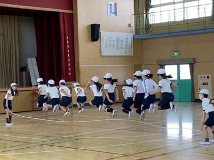 2組の子どもたちは、体育館で長縄を跳んでいます。