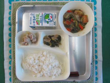 鶏肉のゆず塩焼き、あつあげと野菜の煮もの、こまつなの煮びたし、ご飯、牛乳