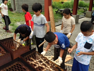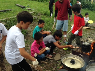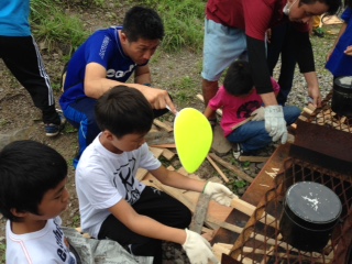 2日目の昼食は、自分たちでカレーライスをつくる飯ごう炊さんです。電気やガスはありません。スイッチ一つで火はつきません。さぁ、大変です。うまくまきを組み合わせて、工夫しよう!ここでも、活動班一人一人の心と力を合わせることが大切です。……。ヤッター!火がついた。