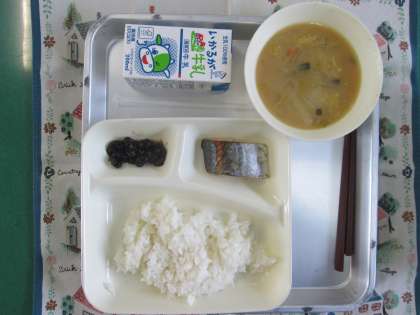 さごしのしょうゆだれかけ、みそ汁、黒豆の煮もの、牛乳