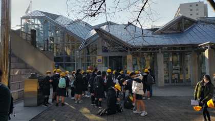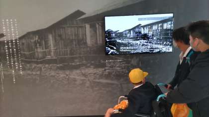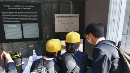 ピースおおさかに着いて見学を始めています。大阪空襲のときの様子に驚いています。