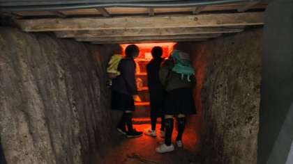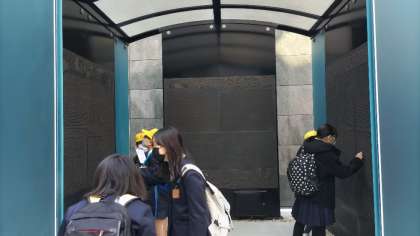 大阪空襲で亡くなられた方々を追悼し、平和を祈念してつくられた「刻の庭」を見学しています。日本で、大阪で戦争があったことを実感しますね。