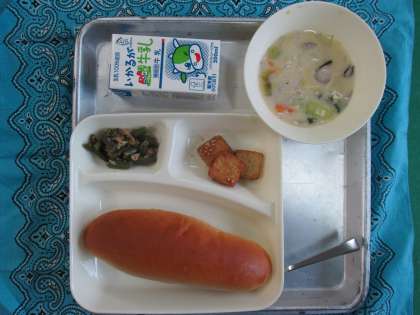 はくさいのクリーム煮、あつあげのごまじょうゆかけ、豚肉とさんどまめのオイスターソースいため、黒糖パン、牛乳