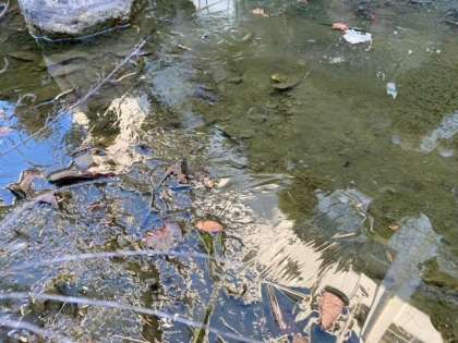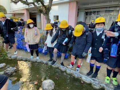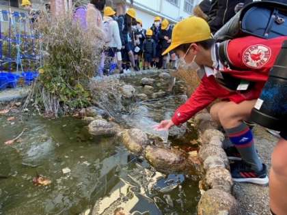 池の周りに子どもたちが集まり、珍しい光景に喜んでいました。