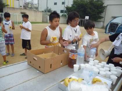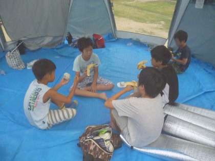 暑かって眠れなかった、家と違って眠れなかったと思います。しかし、みんなは元気でした。朝は、簡単な食事をして後片付けをしました。大きなテントも協力してたたむことができました。