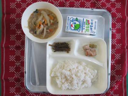 まぐろの甘辛焼き、豚汁、くきわかめのつくだ煮、ご飯、牛乳