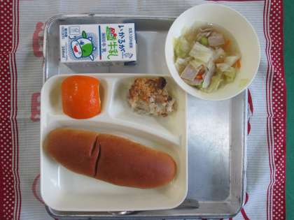 押し麦のグラタン、スープ、いよかん、パン、牛乳