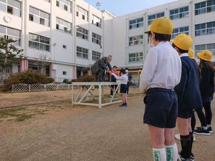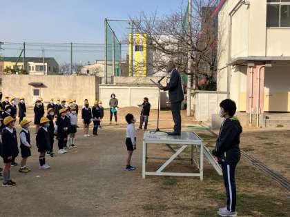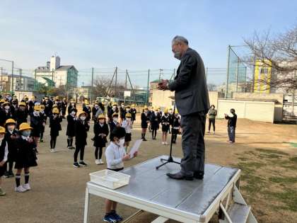 初めに「大阪市小学校児童絵画版画展」の賞状が、校長先生から児童に授与されました。みんなで拍手をしています。