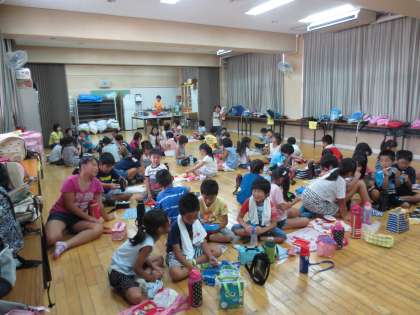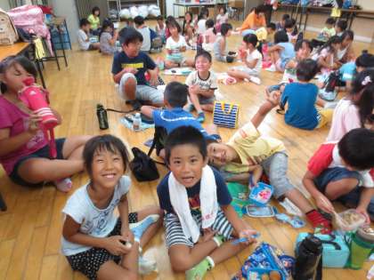 たくさんの子どもたちが、多目的室でお弁当を食べていました。みんなきちんとお話をきいて、行儀よくお昼ごはんを食べていました。