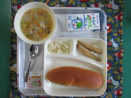 わかさぎフライ、コーンとはくさいのスープ、カリフラワーのサラダ、パン、りんごジャム、牛乳