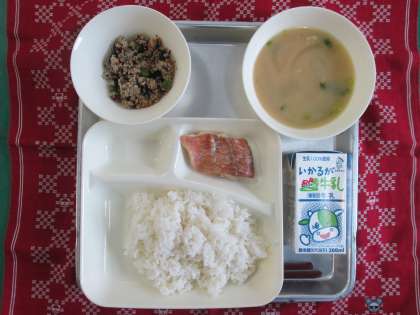 あかうおのレモンじょうゆかけ、うすくず汁、高野どうふのいり煮、ごはん、牛乳