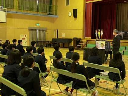 万引きは犯罪であること、暴力や夜遊び・喫煙なども社会のルールやきまりを守らないことからおこることを、人形劇も交えてわかりやすく話してもらいました。