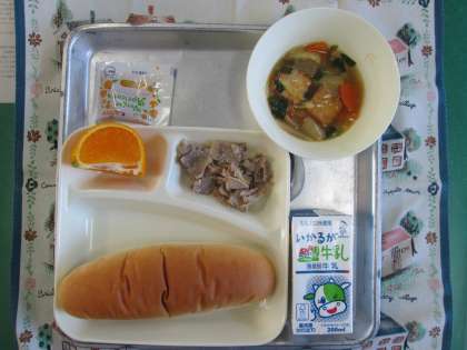 豚肉のオイスターソース焼き、あつあげと野菜の中華煮、デコポン、パン、牛乳